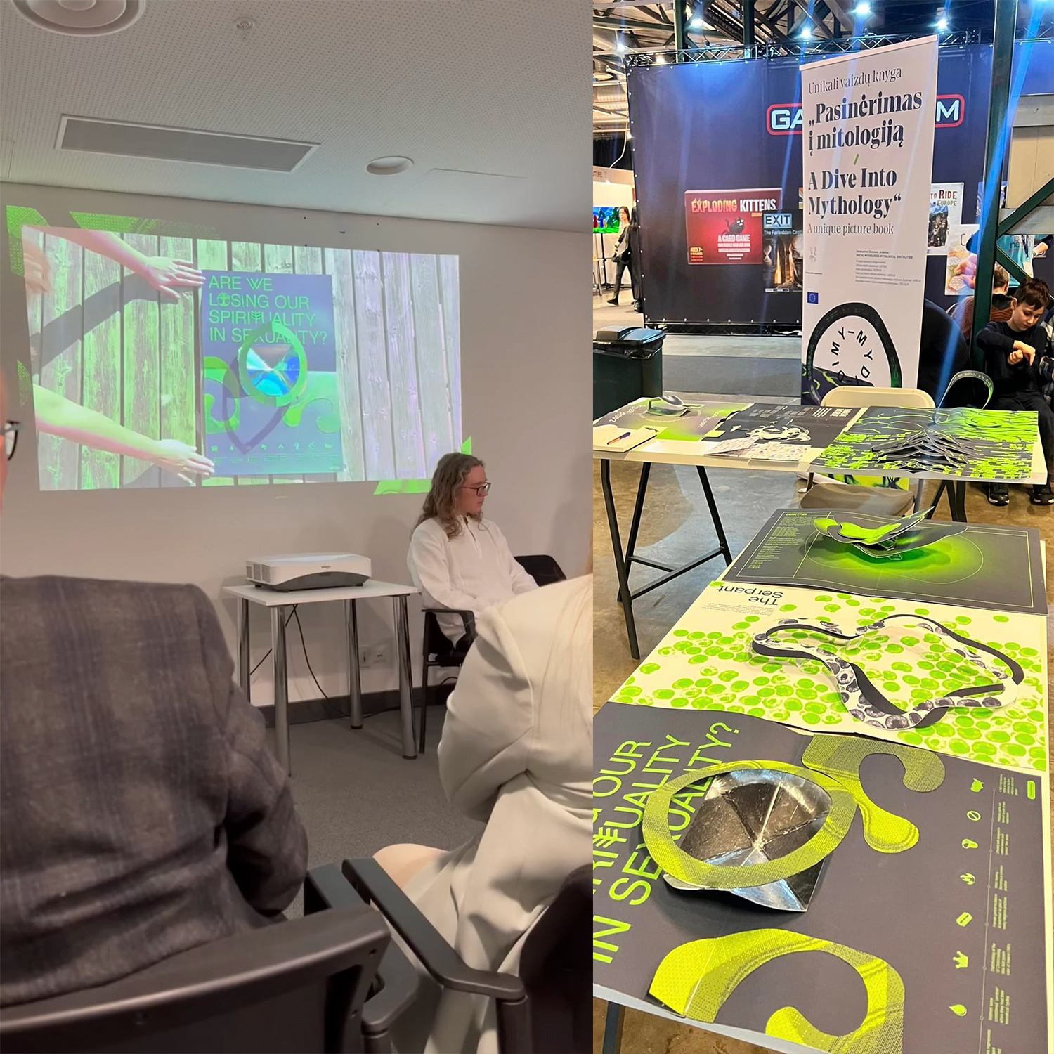 The augmented reality project, in which we, along with fellow international students at the Vilnius Academy of Arts, created AR book flaps on mythology themes. On the last day of the book fair, we had a conference with Dr. Libertas Klimka and Dr. Ignas Šatkauskas, where we discussed Baltic mythology and our workshop projects on mythology, which were showcased in Hall 4 during the book fair at LITEXPO. The book flaps with augmented reality will further travel to Katowice and Antwerp🧚 Thank you, Justin Cholewski, for allowing us to use your and Rūta Loop’s song ‘Leliumoj’ in our project about goddesses.