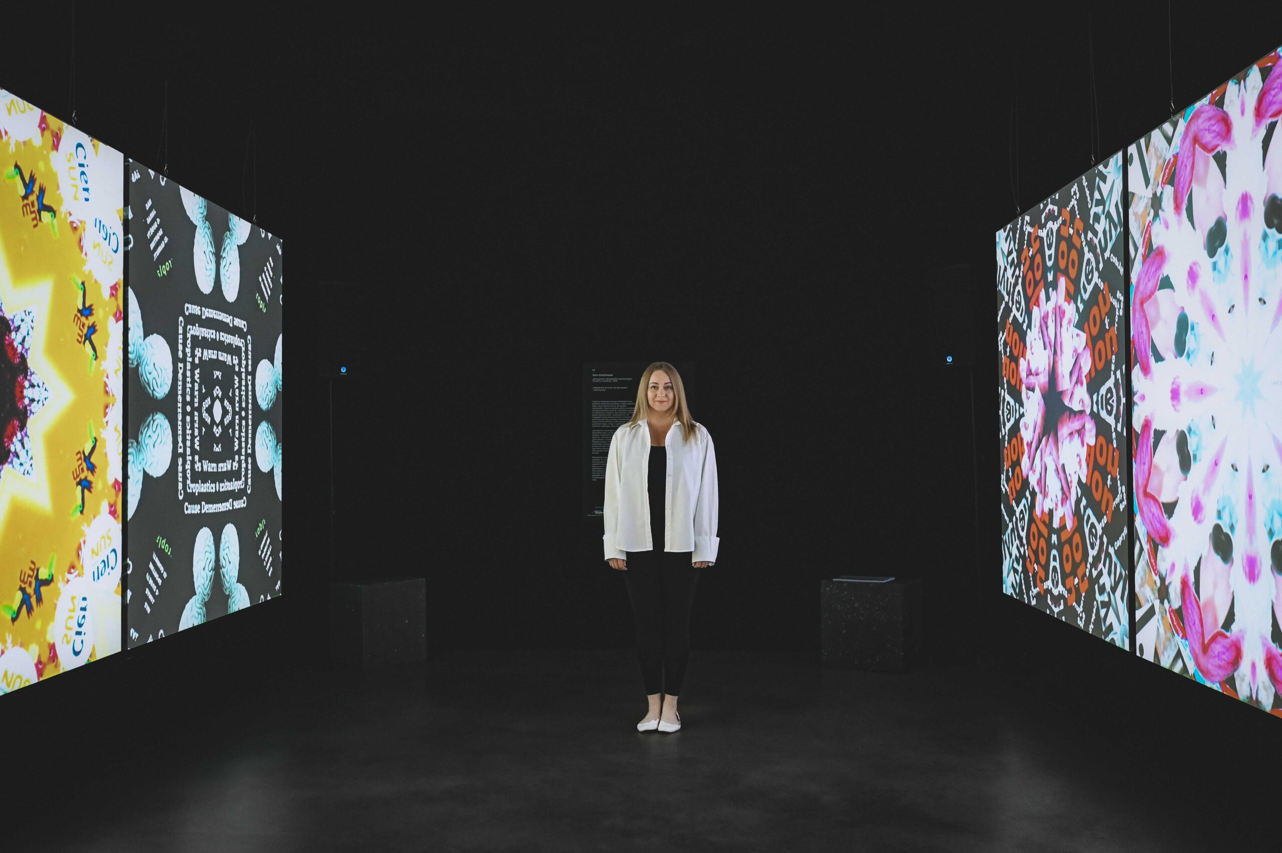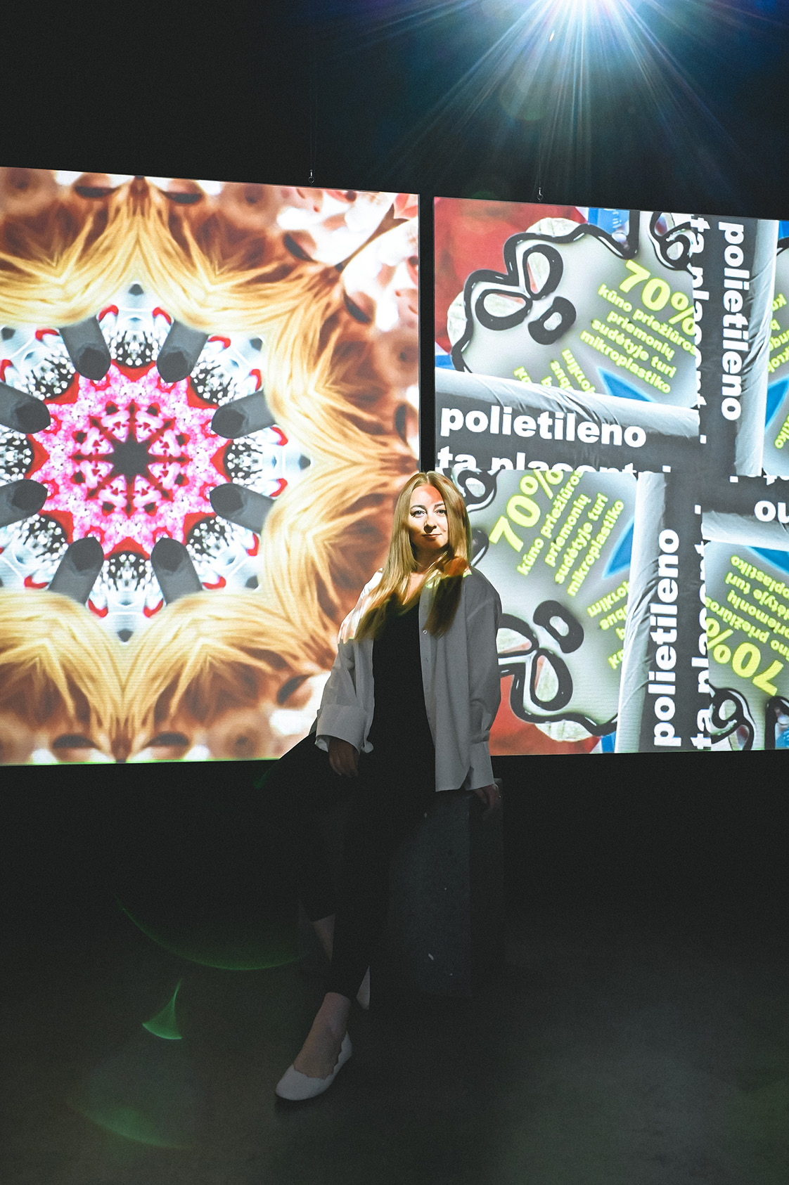 The visual installation combines the issue of microplastics in body care products and the scale of packaging pollution, which, when breaking down, create even more microplastics. Four kaleidoscopic visualizations mimic the cosmetics industry, society „blindness,” and the most significant problems: harm to health and nature, plastic packaging pollution, consumerism. This installation aims to deconstruct the simulation/hypnosis created by body care product manufacturers, in which people are encouraged to consume more, choosing cheap, harmful ingredients for production, such as microplastics.